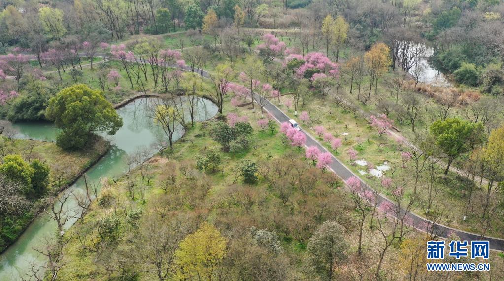 觀光車在浙江杭州西溪濕地內行駛(2021年3月2日攝,無人機照片)。 新華社記者 翁忻旸 攝