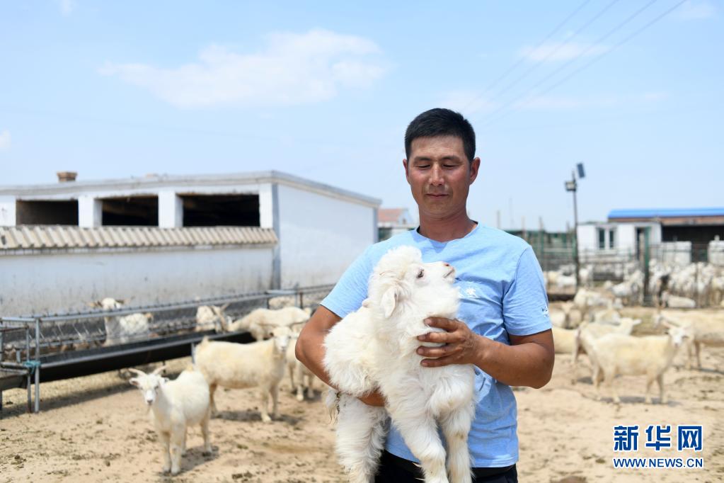內蒙古鄂爾多斯市一名牧民在家中抱起小羊(2021年7月16日攝)。 新華社記者 金良快 攝