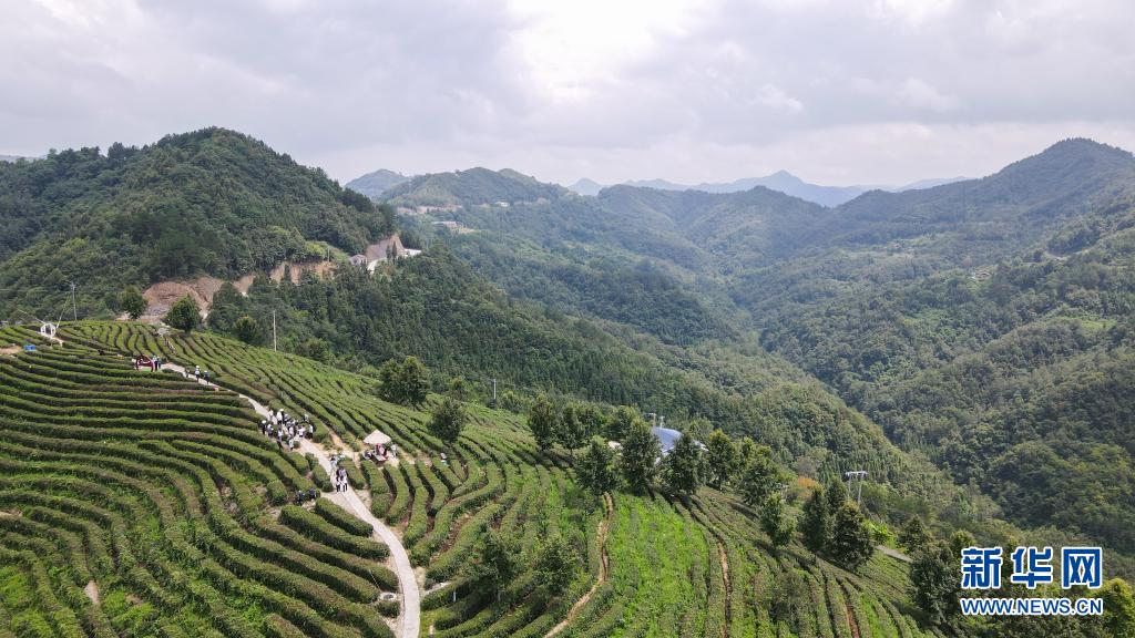 游客在位于陜西省安康市平利縣老縣鎮(zhèn)蔣家坪村的女媧鳳凰茶業(yè)現代示范園區(qū)參觀游玩(2021年7月24日攝,無人機照片)。 新華社記者 徐欽 攝