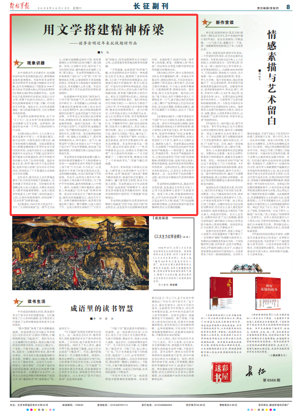 李金明的抗戰(zhàn)題材作品,既是對(duì)歷史的回望,也是通過(guò)文學(xué)的藝術(shù)加工,讓偉大抗戰(zhàn)精神與讀者產(chǎn)生情感共鳴。他筆下的人物,懷揣著純粹的信仰,以平凡的舉動(dòng)詮釋了偉大的篇章。正是這些平凡人物,構(gòu)成了偉大抗戰(zhàn)精神的鮮活載體,讓讀者在閱讀中感受到精神的洗禮與靈魂的震撼。