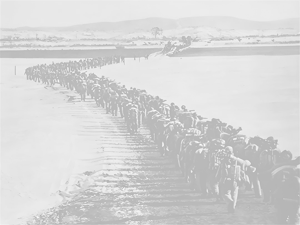 那天,我走進(jìn)駐守于此的陸軍某旅軍史館,不期然與一張老照片相遇。它靜靜地懸掛在墻上,黑白的光影里記錄了志愿軍跨過(guò)鴨綠江的情景:江邊被白雪覆蓋,江中是一座簡(jiǎn)易便橋。志愿軍長(zhǎng)長(zhǎng)的隊(duì)伍正踏著冰雪,徒步通過(guò)便橋向朝鮮戰(zhàn)場(chǎng)開進(jìn)。前面的隊(duì)伍已踏上朝鮮土地,而后面的隊(duì)伍還連接著祖國(guó)的大地。