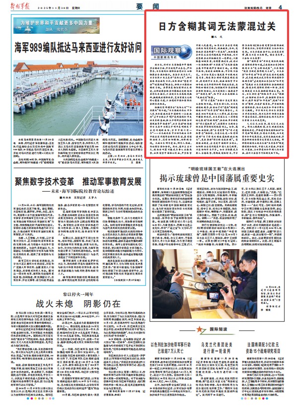 輕描淡寫(xiě)所謂涉臺(tái)“立場(chǎng)未變”“不再提及”行不通?!叭毡緡?guó)政府承認(rèn)中華人民共和國(guó)政府是中國(guó)的唯一合法政府”,《中日聯(lián)合聲明》“是兩國(guó)間和平友好關(guān)系的基礎(chǔ),聯(lián)合聲明所表明的各項(xiàng)原則應(yīng)予嚴(yán)格遵守”,日方承諾“繼續(xù)遵守日本在中日聯(lián)合聲明中表明的關(guān)于臺(tái)灣問(wèn)題的立場(chǎng),重申中國(guó)只有一個(gè)”……日本政府在中日四個(gè)政治文件中就臺(tái)灣問(wèn)題作出的鄭重承諾,具有國(guó)際法效力,沒(méi)有任何模糊、曲解的空間。無(wú)論日本哪個(gè)黨派、哪個(gè)人執(zhí)政,都必須堅(jiān)持和恪守。然而,高市上臺(tái)不久,就狂妄叫囂可能武力介入臺(tái)海局勢(shì),公然侵害中國(guó)核心利益、嚴(yán)重傷害中國(guó)人民感情。如果日方在臺(tái)灣問(wèn)題上的立場(chǎng)沒(méi)有改變,就應(yīng)誠(chéng)實(shí)、準(zhǔn)確、完整地講清其所謂“一貫立場(chǎng)”,坦坦蕩蕩公開(kāi)承認(rèn)臺(tái)灣問(wèn)題純屬中國(guó)內(nèi)政,而不是像現(xiàn)在這樣輕描淡寫(xiě)一筆帶過(guò),只提概念回避實(shí)質(zhì),妄圖蒙混過(guò)關(guān);或者以一句輕飄飄的“不再提及”淡化搪塞掩蓋高市早苗的嚴(yán)重錯(cuò)誤言論。這種掩耳盜鈴、自說(shuō)自話(huà)的做法,中方絕不接受。日方如果真心想發(fā)展中日戰(zhàn)略互惠關(guān)系,構(gòu)建契合新時(shí)代要求的建設(shè)性、穩(wěn)定的中日關(guān)系,就應(yīng)該恪守中日四個(gè)政治文件精神和所作政治承諾,立即收回錯(cuò)誤言論,切實(shí)把對(duì)華承諾體現(xiàn)在實(shí)際行動(dòng)上,而不是倒打一耙要求中方“保持克制”,給中方正當(dāng)反制貼上“反應(yīng)過(guò)度”標(biāo)簽。