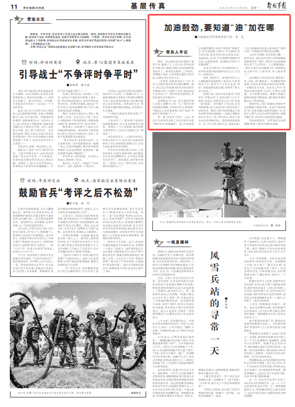 這件事給了我深刻啟發(fā):做思想工作,不能一味“灌雞湯”。引領(lǐng)教育固然重要,但若沒有落地見效的辦法舉措,一切都會淪為空談。在此后工作中,我更加注重發(fā)揮骨干作用,匯聚官兵智慧。眾人拾柴火焰高。隨著大家建言獻策的熱情不斷高漲,連隊解決矛盾問題也有了更多招法。