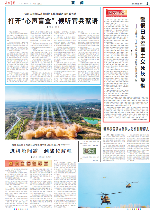 歷史倒車(chē)開(kāi)不得,和平底線(xiàn)碰不得。近代以來(lái),日本軍國(guó)主義瘋狂對(duì)外侵略擴(kuò)張,對(duì)中國(guó)犯下的罪行罄竹難書(shū)。中國(guó)現(xiàn)代化進(jìn)程曾多次被打斷,尤以日本發(fā)動(dòng)的甲午戰(zhàn)爭(zhēng)、全面侵華戰(zhàn)爭(zhēng)為最。強(qiáng)國(guó)必須強(qiáng)軍,軍強(qiáng)才能?chē)?guó)安。黨的二十屆四中全會(huì)著眼強(qiáng)國(guó)建設(shè)、民族復(fù)興偉業(yè),對(duì)如期實(shí)現(xiàn)建軍一百年奮斗目標(biāo),高質(zhì)量推進(jìn)國(guó)防和軍隊(duì)現(xiàn)代化作出重大部署、提出明確要求。每名官兵都應(yīng)錨定目標(biāo)、踔厲奮發(fā),全部精力向打仗聚焦、全部工作向打仗用勁,時(shí)刻準(zhǔn)備為正義而戰(zhàn)、為和平而戰(zhàn)、為人民而戰(zhàn),決不允許日本軍國(guó)主義死灰復(fù)燃、卷土重來(lái)。