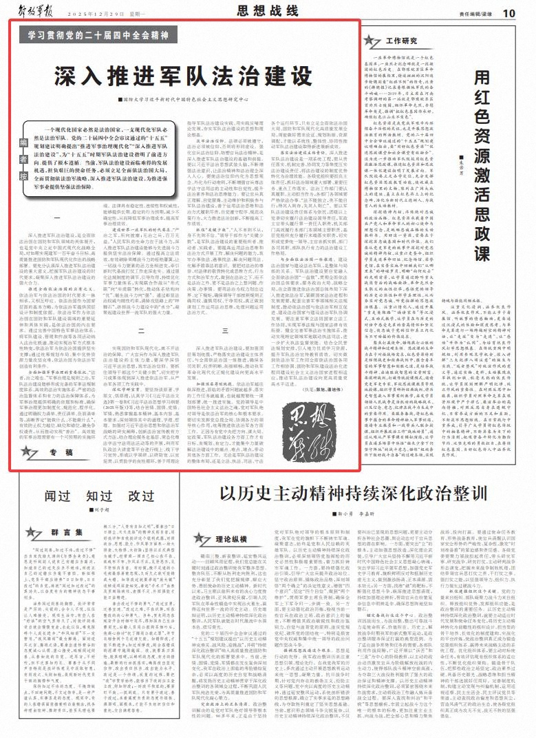 一個現(xiàn)代化國家必然是法治國家,一支現(xiàn)代化軍隊必然是法治軍隊。黨的二十屆四中全會審議通過的“十五五”規(guī)劃建議明確提出“推進軍事治理現(xiàn)代化”“深入推進軍隊法治建設”,為“十五五”時期軍隊法治建設指明了前進方向、提供了根本遵循。當前,軍隊法治建設面臨難得的發(fā)展機遇,擔負艱巨的使命任務,必須立足全面依法治國大局,全面貫徹依法治軍戰(zhàn)略,深入推進軍隊法治建設,為推進強軍事業(yè)提供堅強法治保障。