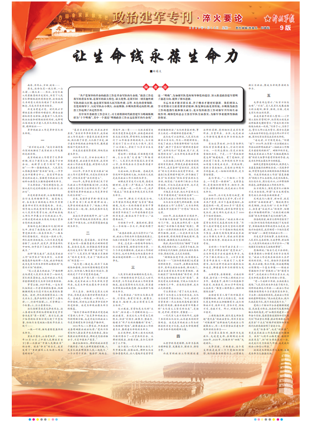 這種“強大威力”,就是我軍政治工作“初步顯示”的生命力。從軍旗被高高舉起的那一天起,政治命脈就成為先輩們用生命和鮮血鑄就的“光榮而不朽”的旗幟。