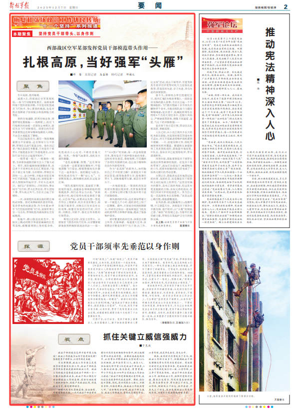 籌劃立足實(shí)際,攻堅(jiān)主官帶頭。從接裝首飛到首次執(zhí)行任務(wù),從學(xué)懂掌握新裝備到積極探索戰(zhàn)法訓(xùn)法……每一個(gè)“從0到1”的突破,每一次急難險(xiǎn)重任務(wù),都有黨員干部沖鋒在前的身影。這樣的率先垂范、靠前指揮,不僅確保了各項(xiàng)任務(wù)圓滿完成,也讓戰(zhàn)斗精神和優(yōu)良作風(fēng)接續(xù)傳承。
