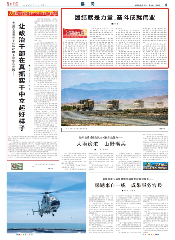 “積力之所舉,則無(wú)不勝也;眾智之所為,則無(wú)不成也。”各級(jí)應(yīng)錨定實(shí)現(xiàn)建軍一百年奮斗目標(biāo),鼓足團(tuán)結(jié)奮斗的精氣神,凝聚“想在一起”的團(tuán)結(jié)之心,激發(fā)“干在一起”的奮斗之力,人人知責(zé)于心、擔(dān)責(zé)于身、履責(zé)于行,個(gè)個(gè)全力投入、全力以赴、全力出擊,在黨的旗幟下團(tuán)結(jié)成“一塊堅(jiān)硬的鋼鐵”,齊心協(xié)力為強(qiáng)軍事業(yè)艱苦奮斗、頑強(qiáng)奮斗、不懈奮斗,把我們黨領(lǐng)導(dǎo)的英雄軍隊(duì)鍛造得更加堅(jiān)強(qiáng),續(xù)寫(xiě)英雄人民軍隊(duì)的浴血榮光。