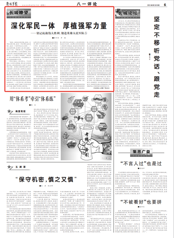 全心全意為人民服務(wù)是我們這支軍隊的根本宗旨。來自人民、為了人民,始終與人民血肉相聯(lián)、生死與共,是我軍的制勝之本、力量之源。我軍自誕生以來,始終把人民放在心中,保持著人民軍隊的性質(zhì)、宗旨、本色,一代代官兵成為人民心目中“最可愛的人”。新征程上,我們應(yīng)堅持以人民為中心,模范踐行全心全意為人民服務(wù)的根本宗旨,發(fā)揚密切聯(lián)系群眾的優(yōu)良傳統(tǒng),履行好為人民扛槍、為人民打仗的神圣職責(zé),積極支援地方經(jīng)濟社會發(fā)展,勇于承擔(dān)急難險重任務(wù),以實際行動為人民造福興利,始終做人民信賴、人民擁護、人民熱愛的子弟兵。
