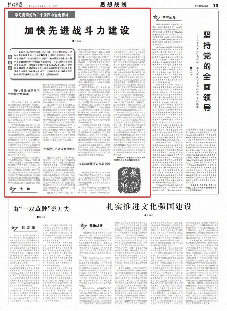 黨的二十屆四中全會(huì)通過的《中共中央關(guān)于制定國民經(jīng)濟(jì)和社會(huì)發(fā)展第十五個(gè)五年規(guī)劃的建議》提出“創(chuàng)新戰(zhàn)斗力建設(shè)和運(yùn)用模式”“加快先進(jìn)戰(zhàn)斗力建設(shè)”,充分體現(xiàn)了我們黨對(duì)現(xiàn)代戰(zhàn)爭制勝機(jī)理的深刻把握和前瞻布局。當(dāng)前,世界百年變局加速演進(jìn),新一輪科技革命和產(chǎn)業(yè)變革深入發(fā)展,國際力量對(duì)比深刻調(diào)整,我們必須保持時(shí)不我待的緊迫感責(zé)任感,加快先進(jìn)戰(zhàn)斗力建設(shè),為如期實(shí)現(xiàn)建軍一百年奮斗目標(biāo)、高質(zhì)量推進(jìn)國防和軍隊(duì)現(xiàn)代化注入強(qiáng)大動(dòng)力、提供堅(jiān)強(qiáng)保障。