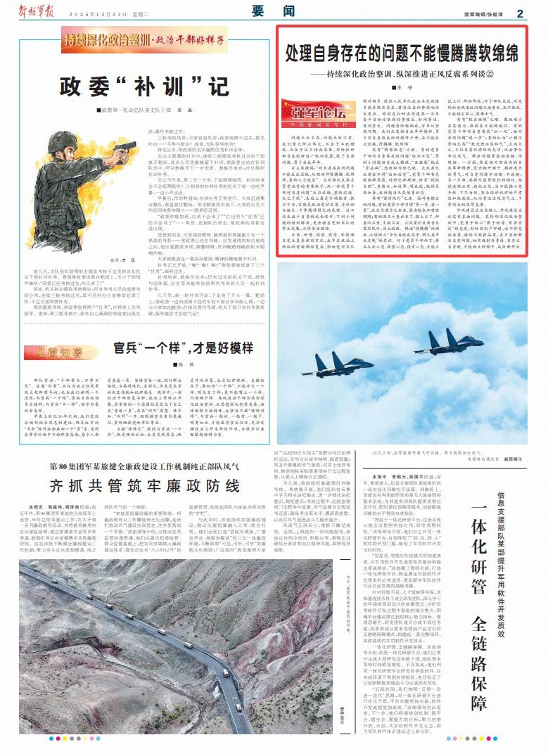 當(dāng)前,世情、國(guó)情、黨情、軍情都在發(fā)生復(fù)雜深刻變化,我軍在政治上面臨的考驗(yàn)錯(cuò)綜復(fù)雜,影響黨對(duì)軍隊(duì)絕對(duì)領(lǐng)導(dǎo)、侵蝕人民軍隊(duì)政治本色的諸多因素現(xiàn)實(shí)存在,肅清流毒積弊影響仍未見(jiàn)底。特別是打好實(shí)現(xiàn)建軍一百年奮斗目標(biāo)攻堅(jiān)戰(zhàn)任務(wù)艱巨、時(shí)間緊迫、責(zé)任重大。問(wèn)題清除越徹底,百年攻堅(jiān)越可期。我們應(yīng)發(fā)揚(yáng)自我革命精神,勇于同自身存在的問(wèn)題作斗爭(zhēng),決不能反應(yīng)遲鈍,慢騰騰、軟綿綿。