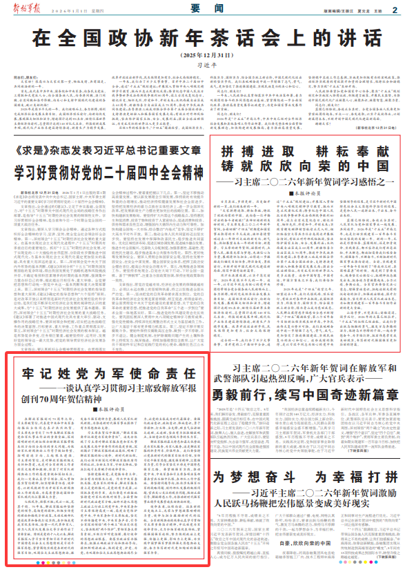 在解放軍報(bào)創(chuàng)刊70周年之際,習(xí)主席致賀信,代表黨中央和中央軍委向報(bào)社全體同志表示熱烈祝賀。習(xí)主席充分肯定了70年來解放軍報(bào)為黨和軍隊(duì)事業(yè)作出的重要貢獻(xiàn),深刻闡明新時(shí)代新征程辦好解放軍報(bào)帶根本性方向性全局性的重大問題,為做好軍隊(duì)新聞?shì)浾摴ぷ骷挠枰笄邢M⒅该髑斑M(jìn)方向、立起根本遵循。習(xí)主席的賀信,是對(duì)解放軍報(bào)的極大關(guān)懷和厚愛,也是對(duì)全軍新聞工作者的巨大鼓舞和激勵(lì),彰顯了對(duì)軍隊(duì)新聞?shì)浾摴ぷ鞯母叨戎匾暫蜕钋嘘P(guān)注。我們一定要認(rèn)真學(xué)習(xí)領(lǐng)會(huì)、深入貫徹落實(shí)賀信精神,切實(shí)增強(qiáng)責(zé)任感、使命感,以新風(fēng)貌新作為開創(chuàng)軍隊(duì)新聞?shì)浾摴ぷ餍戮置妫瑸楦哔|(zhì)量推進(jìn)國防和軍隊(duì)現(xiàn)代化匯聚強(qiáng)大力量。