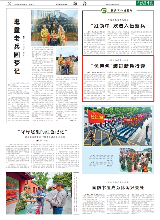 中國國防報(bào)訊 嚴(yán)明亮、李小龍報(bào)道:9月12日,江蘇省揚(yáng)州市江都區(qū)民兵訓(xùn)練基地人頭攢動(dòng),該區(qū)歡送新兵儀式在這里舉行。歡送儀式上,該區(qū)軍地聯(lián)合為即將奔赴軍營的新兵送上專屬“優(yōu)待包”,讓他們感受到來自家鄉(xiāng)的溫暖。