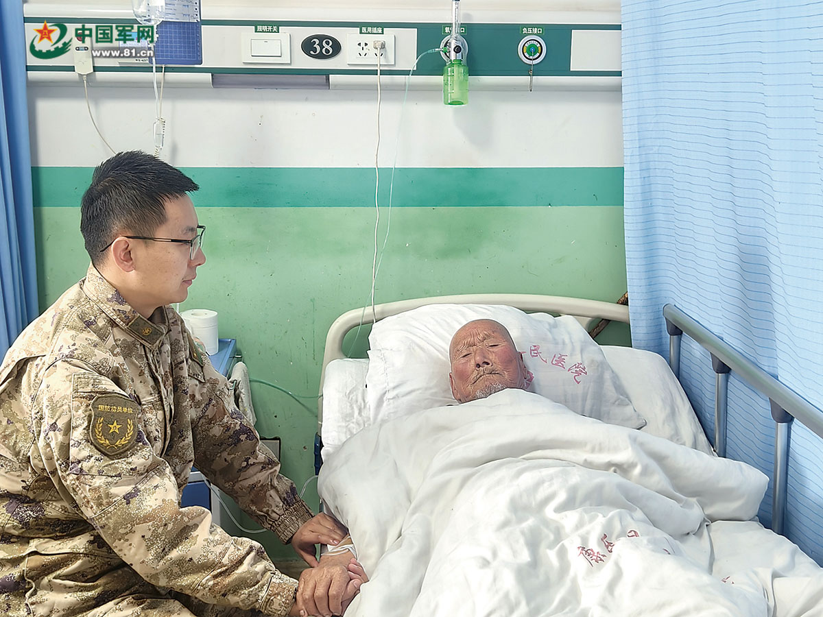 甘肅省康樂縣人武部工作人員探望正在住院的馬明禮老人(右)。