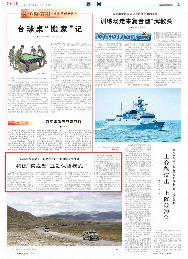 “保障官兵健康、服務(wù)部隊(duì)打贏,是我們的第一職責(zé)和核心使命?!痹撝行念I(lǐng)導(dǎo)介紹,此前,他們深入基層調(diào)研發(fā)現(xiàn),一些單位存在科研成果“含戰(zhàn)量”不高、打仗意識(shí)弱化、戰(zhàn)法創(chuàng)新滯后等問(wèn)題。為此,該中心黨委研究決定,緊扣“研、醫(yī)、教、戰(zhàn)”中心任務(wù),以探索創(chuàng)新衛(wèi)勤保障制度機(jī)制為突破口,著力構(gòu)建“實(shí)戰(zhàn)型”衛(wèi)勤保障模式,推動(dòng)保障力向戰(zhàn)斗力高效轉(zhuǎn)化。