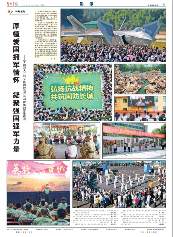 剛剛過(guò)去的9月,全國(guó)各地、軍營(yíng)內(nèi)外再次集中開(kāi)展“全民國(guó)防教育月”活動(dòng)。這是弘揚(yáng)愛(ài)國(guó)主義精神、增強(qiáng)全民國(guó)防意識(shí)的有效途徑,架起了軍民同心、共建國(guó)防的橋梁,凝聚起強(qiáng)國(guó)強(qiáng)軍的磅礴力量。讓我們以影像為媒,回顧國(guó)防教育的生動(dòng)實(shí)踐,領(lǐng)略國(guó)防建設(shè)的偉大成就,感悟共筑鋼鐵長(zhǎng)城的責(zé)任擔(dān)當(dāng)。