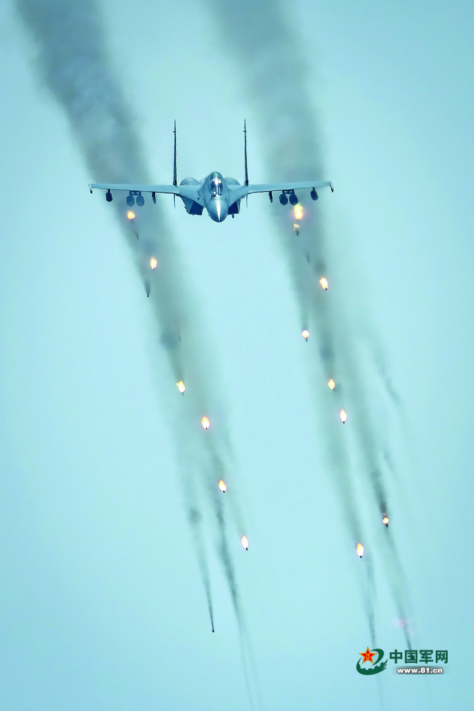 完成加油后,編隊再次前出。此時,擔負對地打擊任務的戰(zhàn)機,對“敵”重要目標實施火力覆蓋,為地面進攻力量提供空中支援。