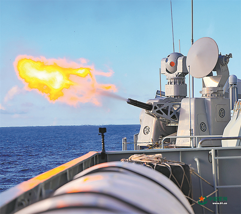 硝煙未散,對海突擊訓練接續(xù)展開。各艦高速機動,占領有利攻擊陣位。在編隊統(tǒng)一指揮下,各艦主炮對“敵”水面目標發(fā)起火力打擊。