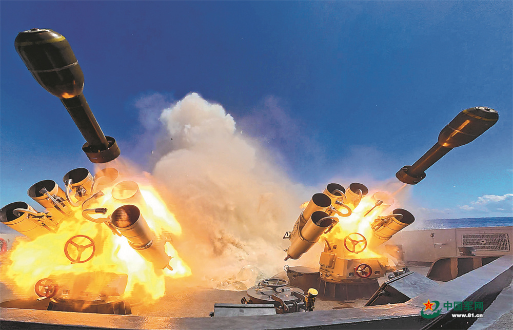 艦艇發(fā)射火箭深彈(視頻截圖)。