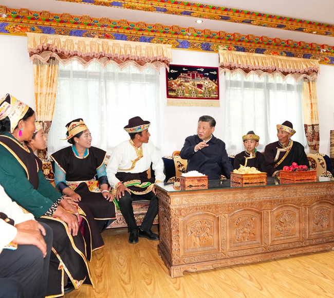 2021年7月21日下午,習(xí)近平在林芝市巴宜區(qū)林芝鎮(zhèn)嘎拉村,同村民達(dá)瓦堅(jiān)參一家人圍坐在客廳里聊家常。新華社記者 李學(xué)仁 攝