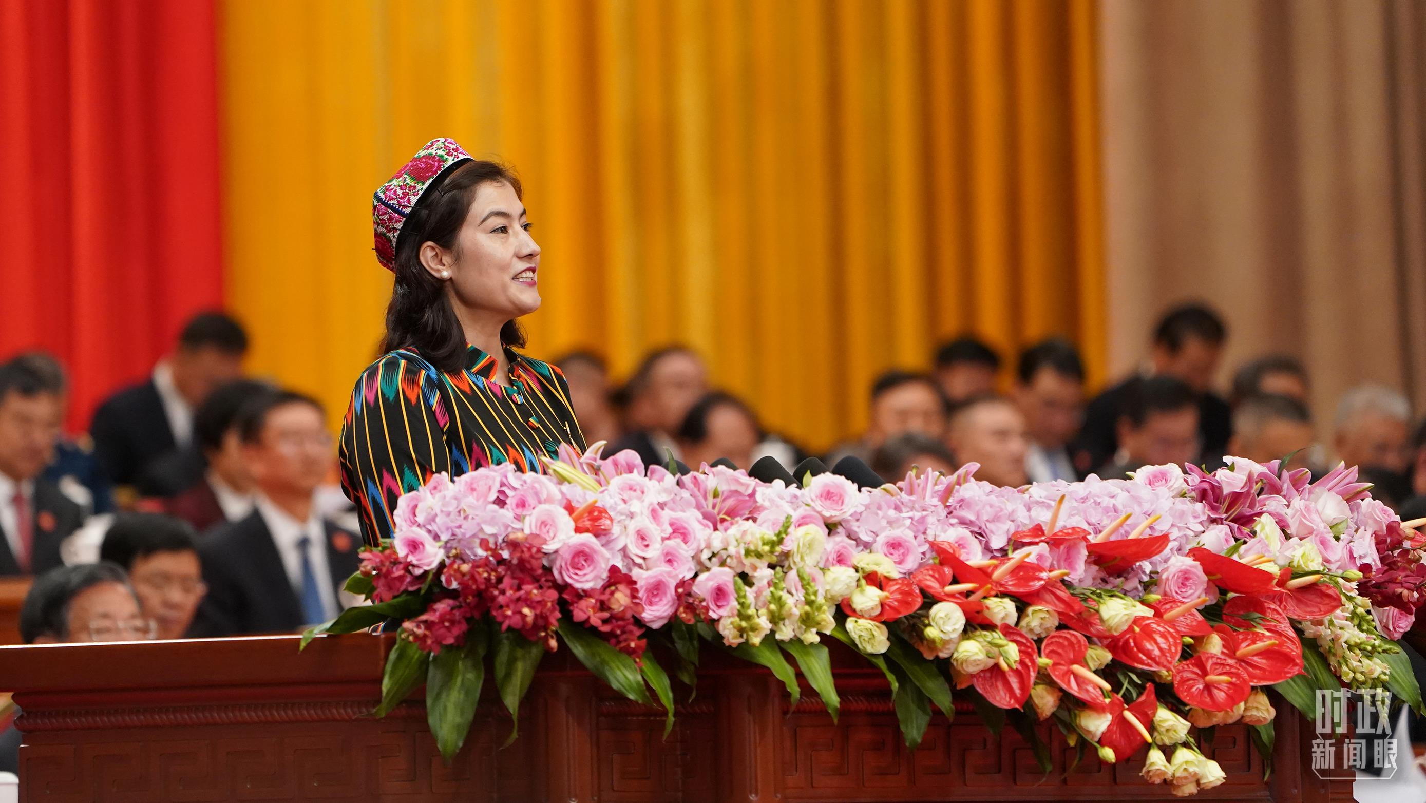 △艾米拉古麗·阿不都在慶祝大會(huì)上發(fā)言。(總臺(tái)記者李晉拍攝)
