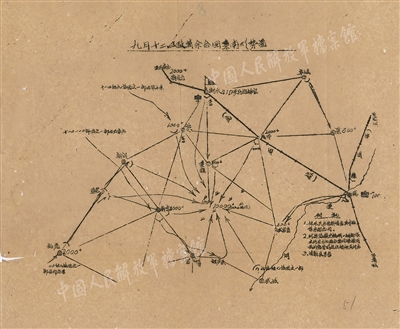 解放軍檔案館館藏檔案《九月十二日敵萬余合圍棗南形勢圖》。