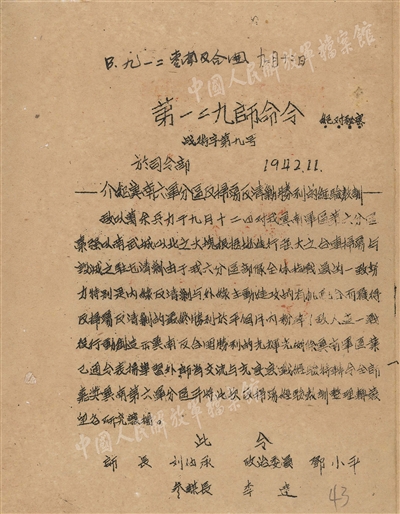 第一二九師司令部編印《一九四二年作戰(zhàn)材料》“九一二棗南反合圍”首頁。