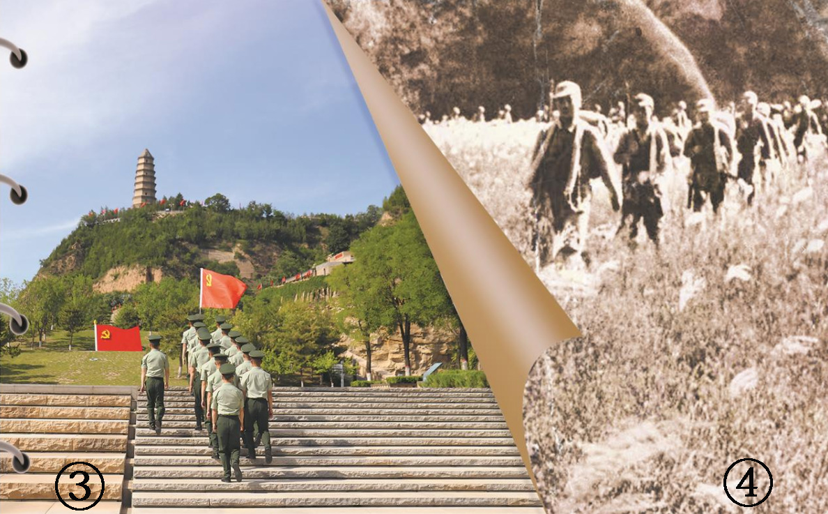 圖③:武警延安支隊執(zhí)勤一中隊組織黨員在寶塔山下開展黨日活動。李云鵬攝 圖④:八路軍戰(zhàn)士向南泥灣進(jìn)軍。新華社發(fā)