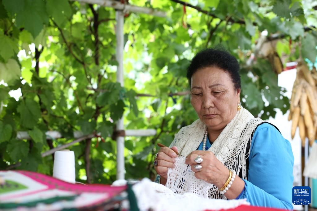 9月9日,75歲的哈薩克族老人古麗塞肯·比達合買提在“戶兒家”文化大院編織。