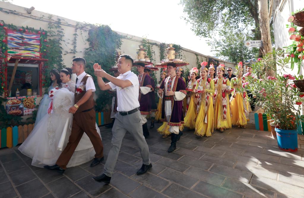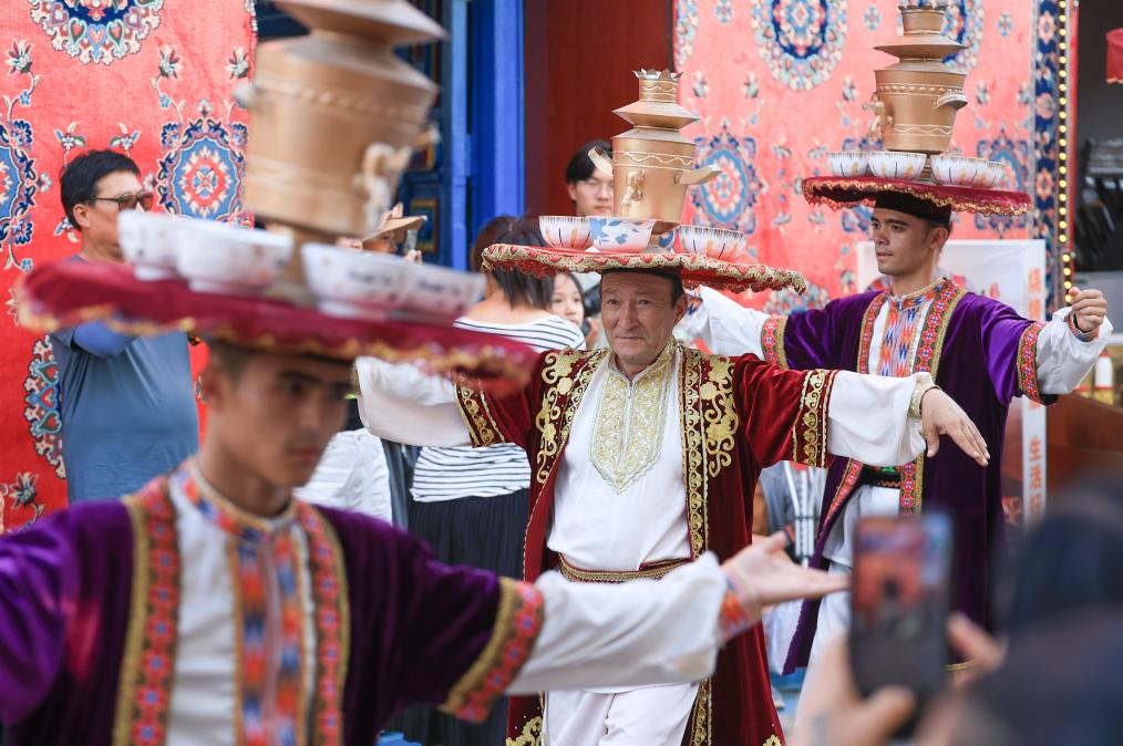 7月22日,在新疆庫車市的龜茲小巷,表演薩瑪瓦爾舞的演員參與當(dāng)?shù)氐囊粓龌槎Y活動。新華社記者 王菲 攝