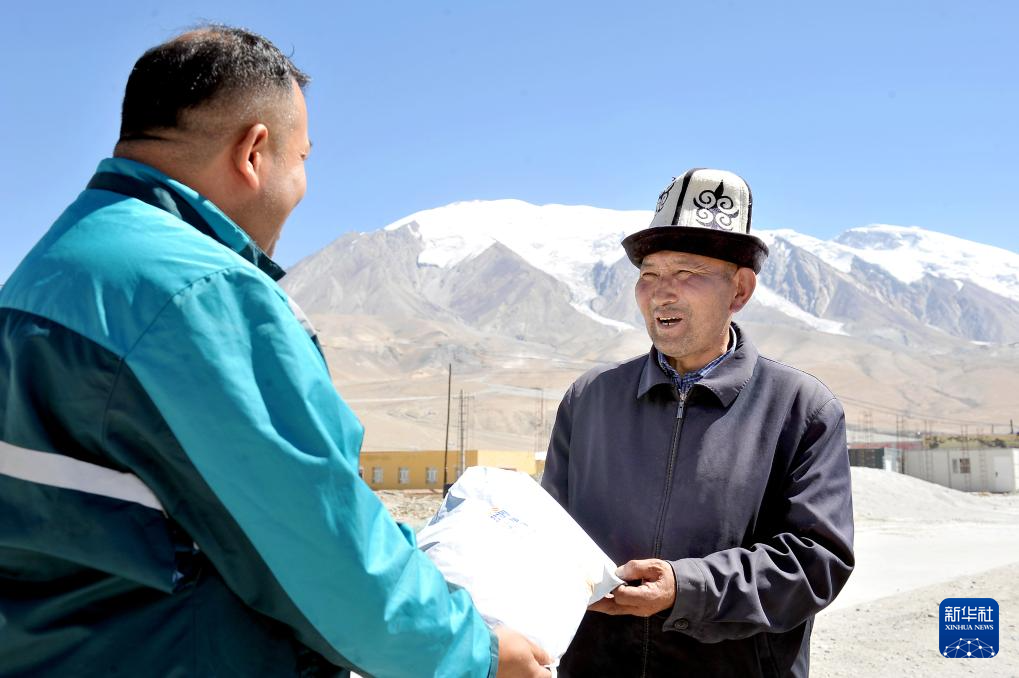 投遞員阿克阿不都賽米·賽買提(左)把包裹送到新疆克孜勒蘇柯爾克孜自治州阿克陶縣布倫口鄉(xiāng)布倫口村夏迪別克·排爾慢手中。郵路延伸到雪山腳下,讓生活在邊疆的各族民眾也能享受到和城市居民一樣快捷方便的郵政服務(wù)(9月9日攝)。
