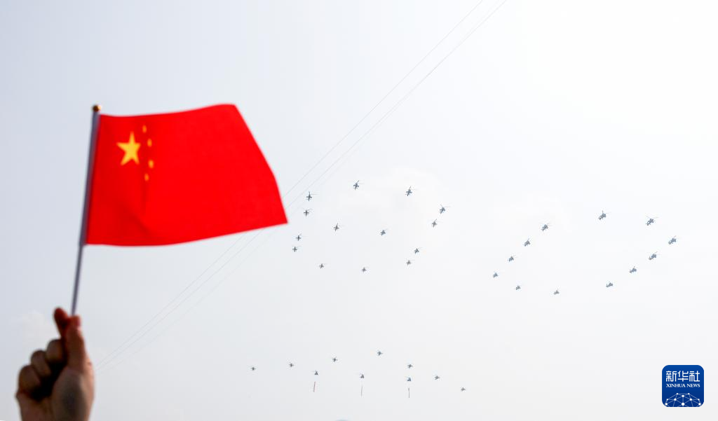 9月3日,紀(jì)念中國(guó)人民抗日戰(zhàn)爭(zhēng)暨世界反法西斯戰(zhàn)爭(zhēng)勝利80周年大會(huì)在北京隆重舉行。這是空中護(hù)旗梯隊(duì)。