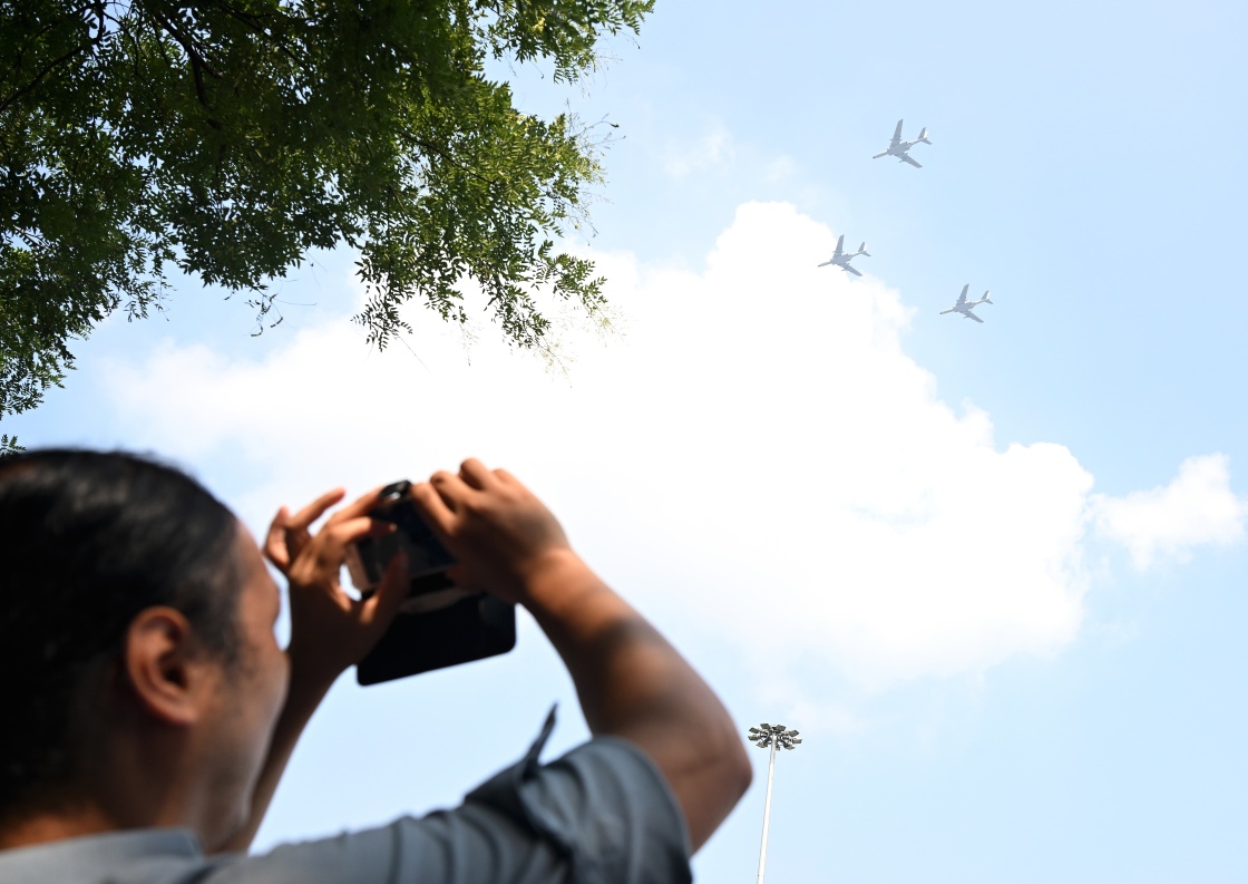 9月3日,紀(jì)念中國人民抗日戰(zhàn)爭(zhēng)暨世界反法西斯戰(zhàn)爭(zhēng)勝利80周年大會(huì)在北京隆重舉行。這是市民在拍攝轟炸機(jī)梯隊(duì)。