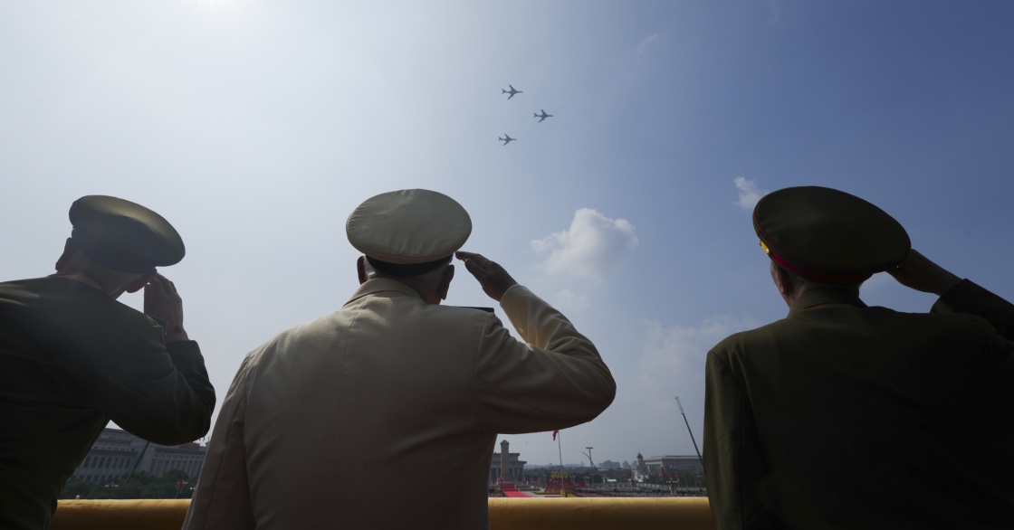 9月3日,紀(jì)念中國人民抗日戰(zhàn)爭(zhēng)暨世界反法西斯戰(zhàn)爭(zhēng)勝利80周年大會(huì)在北京隆重舉行。這是轟炸機(jī)梯隊(duì)飛過天安門廣場(chǎng)上空時(shí)嘉賓敬禮。