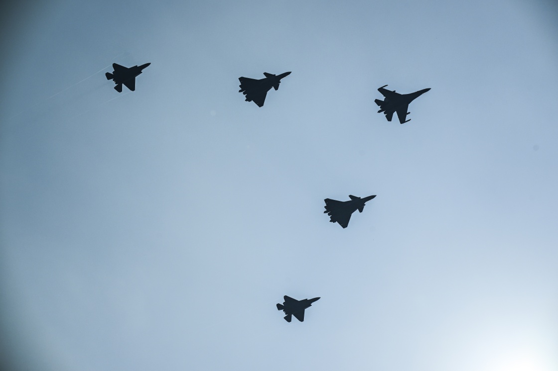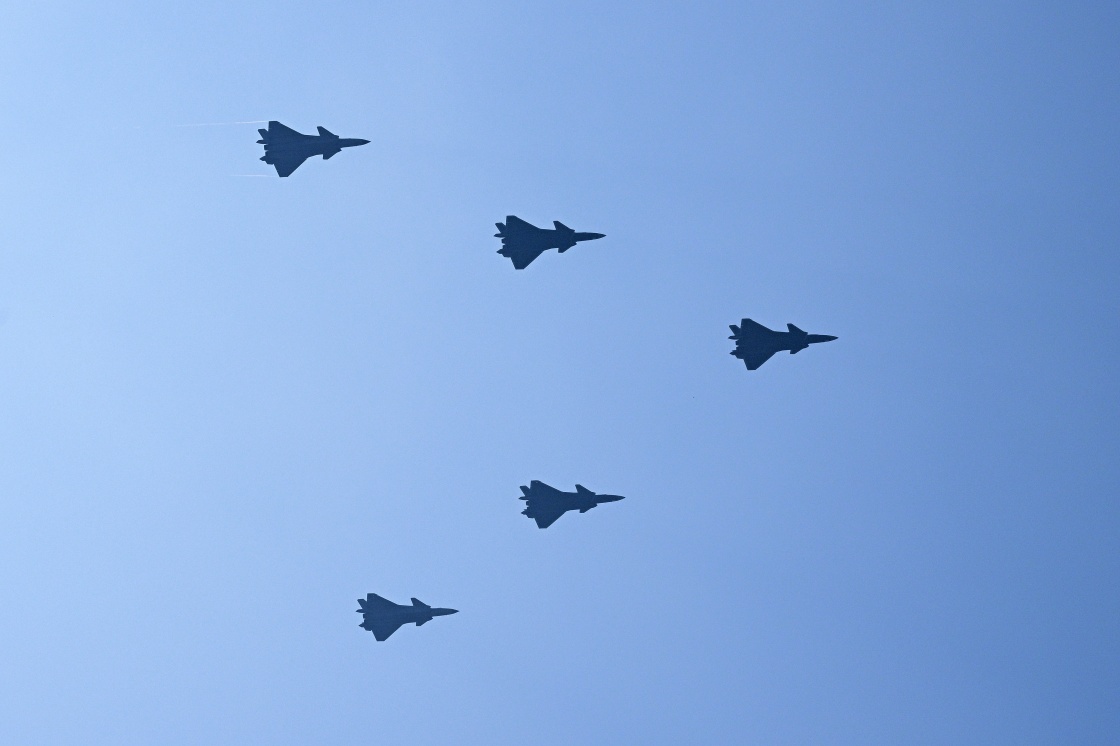 9月3日,紀(jì)念中國人民抗日戰(zhàn)爭暨世界反法西斯戰(zhàn)爭勝利80周年大會在北京隆重舉行。這是殲擊機梯隊。