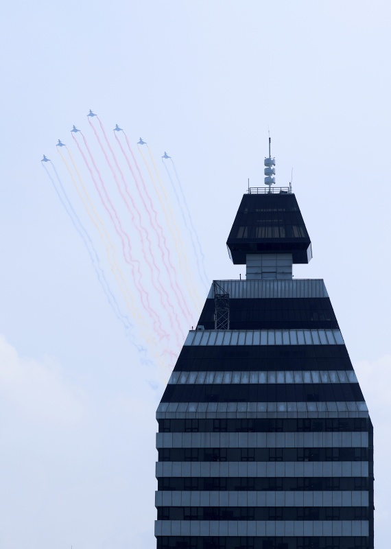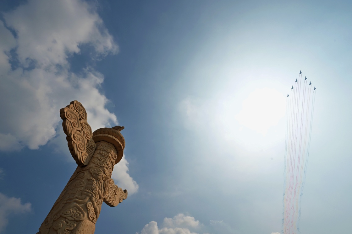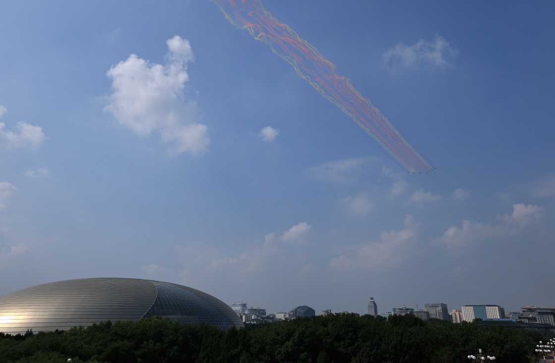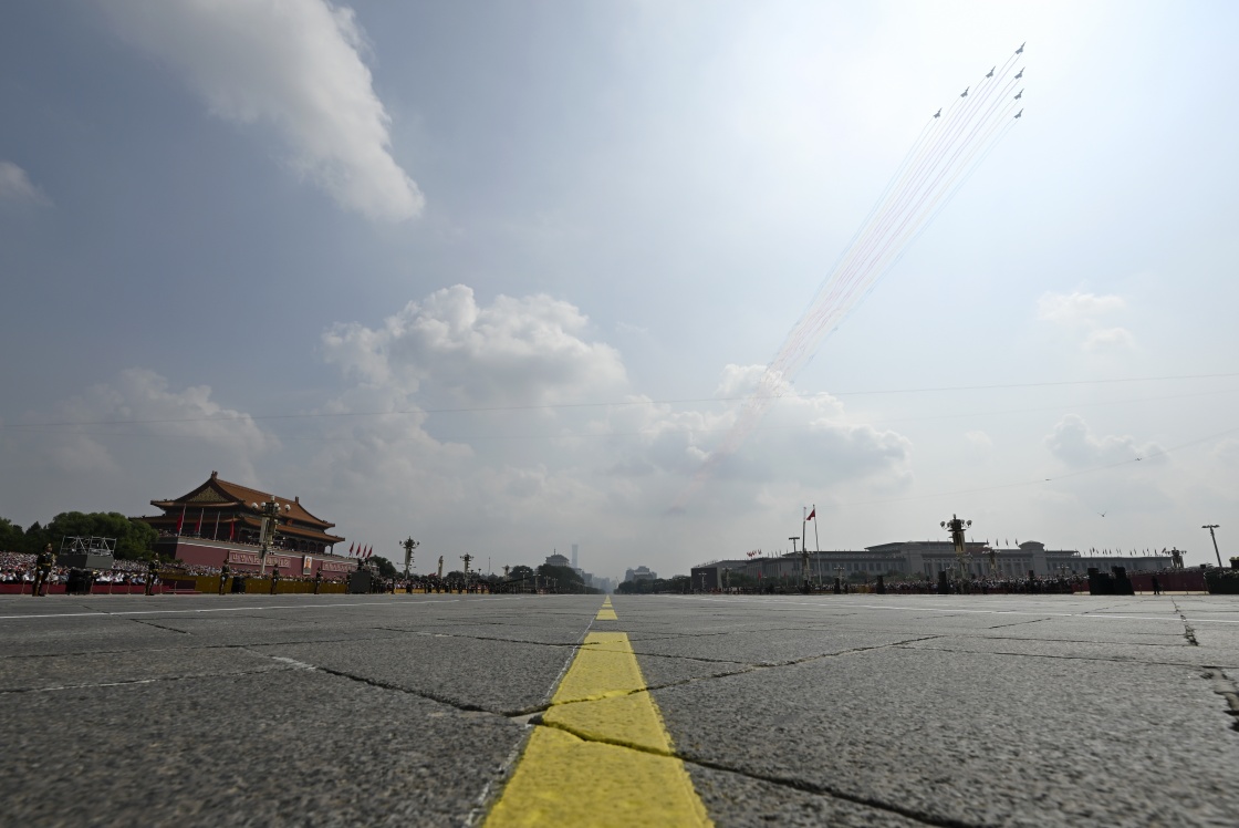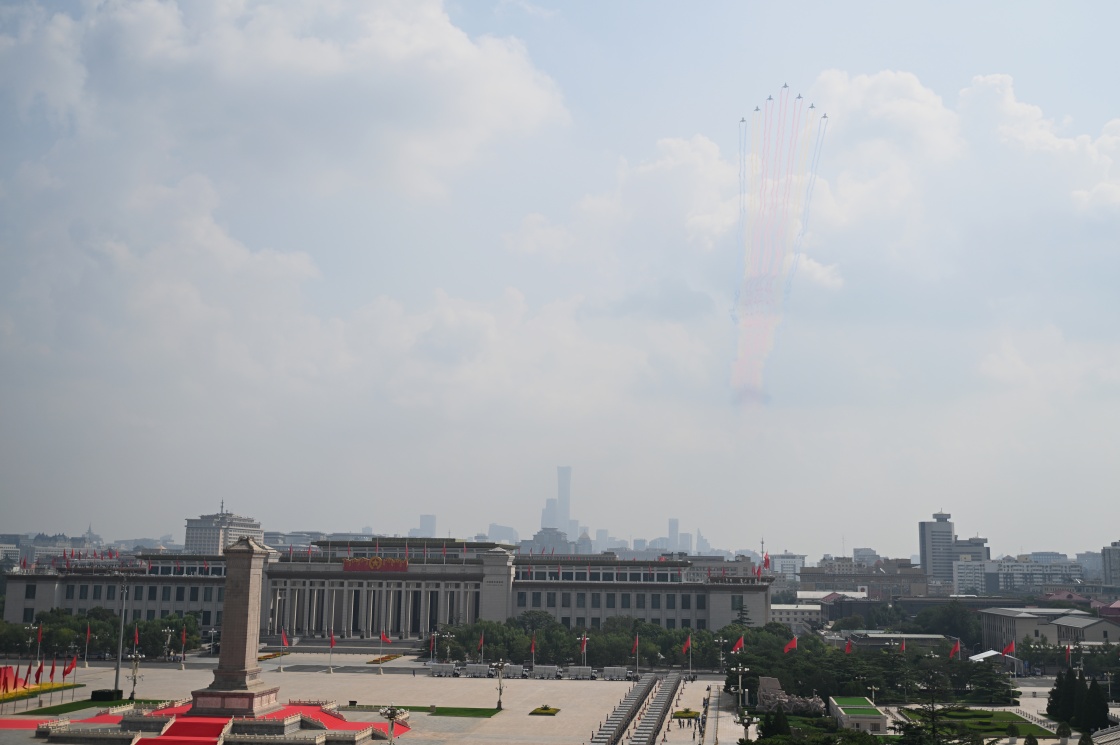 9月3日,紀念中國人民抗日戰(zhàn)爭暨世界反法西斯戰(zhàn)爭勝利80周年大會在北京隆重舉行。這是教練機梯隊飛過天安門廣場上空。