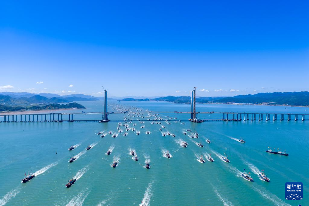 9月16日,漁船經(jīng)過浙江省寧波市象山港大橋開赴東海作業(yè)。新華社發(fā)