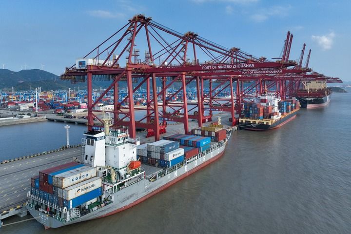 2025年10月13日,在寧波舟山港金塘港區(qū)大浦口集裝箱碼頭,船舶進(jìn)行集裝箱裝卸作業(yè)(無人機(jī)照片)。新華社發(fā)(鄒訓(xùn)永攝)
