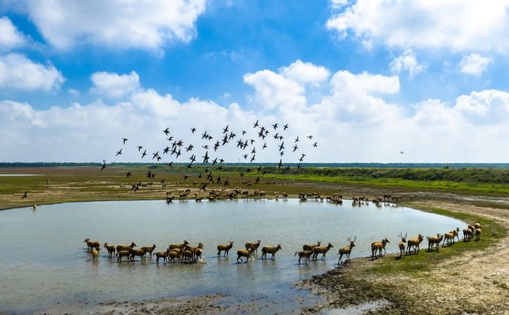 2025年10月11日,在江蘇東臺條子泥濕地,候鳥飛翔,成群野生麋鹿悠閑散步,一派人與自然和諧共生的生態(tài)美景(無人機(jī)照片)。新華社發(fā)(孫家錄攝)