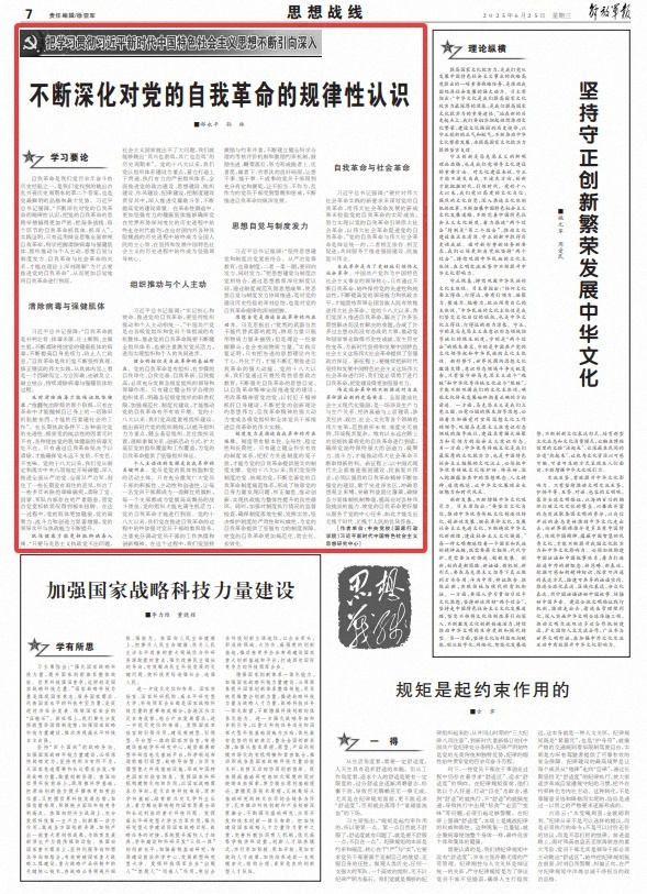 習近平總書記強調(diào):“要針對偉大社會革命實踐的新要求來謀劃黨的自我革命,用偉大社會革命發(fā)展的新成果來檢驗黨的自我革命的實際成效,努力實現(xiàn)以黨的自我革命引領偉大社會革命、以偉大社會革命促進黨的自我革命?!秉h的自我革命與偉大社會革命是辯證統(tǒng)一的,二者相互依存、相互促進,共同服務于推進強國建設、民族復興偉業(yè)。