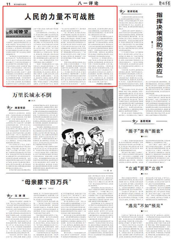 “中國人民抗日戰(zhàn)爭勝利是全體中華兒女勠力同心、以弱勝強(qiáng)的雄渾史詩,顯示了中國人民和中華兒女堅(jiān)不可摧的磅礴力量!”習(xí)主席的重要論述,深刻闡明了抗戰(zhàn)勝利的根本動(dòng)力,更深刻啟示人民是決定黨和國家前途命運(yùn)的根本力量,永遠(yuǎn)是我們黨最堅(jiān)實(shí)的依托、最強(qiáng)大的底氣。歷史的啟迪不容忘卻,人民的力量不可戰(zhàn)勝?;赝麣v史,我們緊緊依靠人民創(chuàng)造了無數(shù)奇跡;新征程上,我們?nèi)匀灰揽咳嗣駝?chuàng)造新的歷史偉業(yè)。