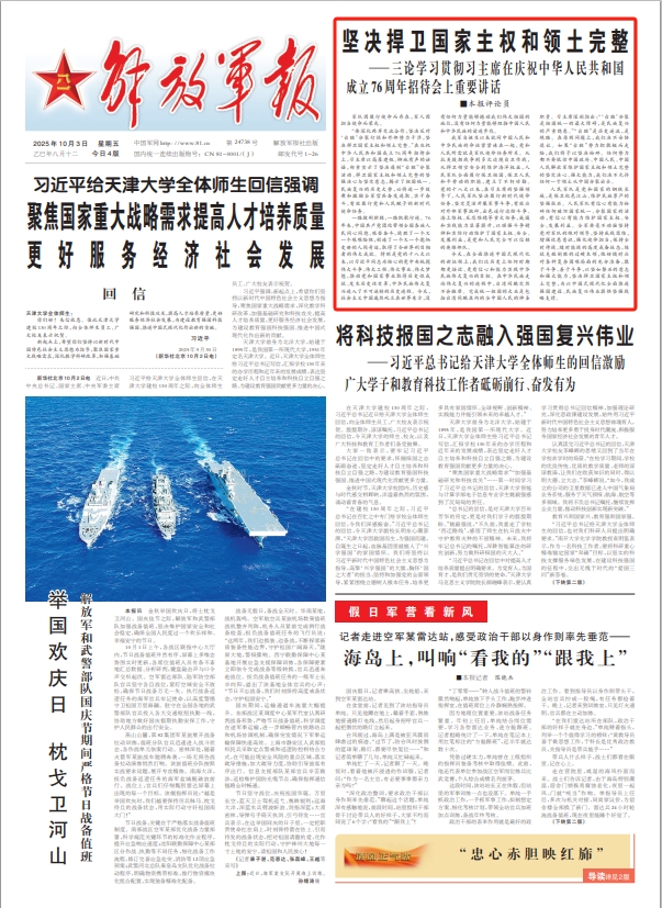 “要深化兩岸交流合作,堅(jiān)決反對(duì)‘臺(tái)獨(dú)’分裂行徑和外部勢(shì)力干涉,堅(jiān)決捍衛(wèi)國(guó)家主權(quán)和領(lǐng)土完整?!痹趹c祝中華人民共和國(guó)成立76周年招待會(huì)上,習(xí)主席以高屋建瓴、擲地有聲的話語(yǔ),鄭重宣示了堅(jiān)決遏制“臺(tái)獨(dú)”分裂活動(dòng)、捍衛(wèi)國(guó)家主權(quán)和領(lǐng)土完整的堅(jiān)強(qiáng)決心與堅(jiān)定意志,揭示了祖國(guó)統(tǒng)一、民族復(fù)興的歷史大勢(shì),必將進(jìn)一步鼓舞和激勵(lì)全軍官兵奮發(fā)進(jìn)取、實(shí)干奮斗,有效履行黨和人民賦予的新時(shí)代使命任務(wù)。
