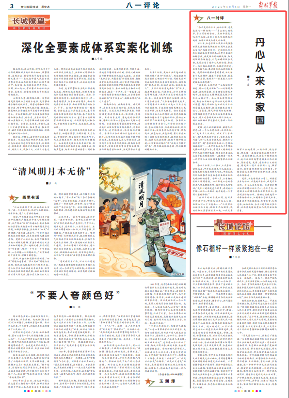 “我站立的地方是中國(guó),我用生命捍衛(wèi)守候,哪怕風(fēng)似刀來山如鐵,祖國(guó)山河一寸不能丟……”人民軍隊(duì)從誕生之日起,就把自己與國(guó)家、民族的命運(yùn)緊緊聯(lián)系在一起,一代代革命軍人赤誠(chéng)愛國(guó)、以身許國(guó)、精忠報(bào)國(guó),樹立起一座座愛國(guó)奉獻(xiàn)的不朽豐碑。在強(qiáng)國(guó)建設(shè)、民族復(fù)興的新征程上,我們應(yīng)繼續(xù)高擎愛國(guó)主義偉大旗幟,厚植愛黨、愛國(guó)、愛社會(huì)主義的情感,將愛國(guó)之情化為報(bào)國(guó)之志、強(qiáng)軍之行,忠實(shí)履行新時(shí)代使命任務(wù),爭(zhēng)做愛國(guó)主義精神的堅(jiān)定弘揚(yáng)者、實(shí)踐者和傳播者。