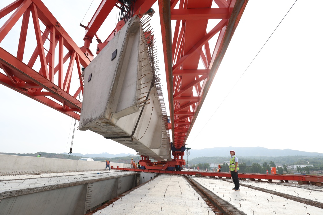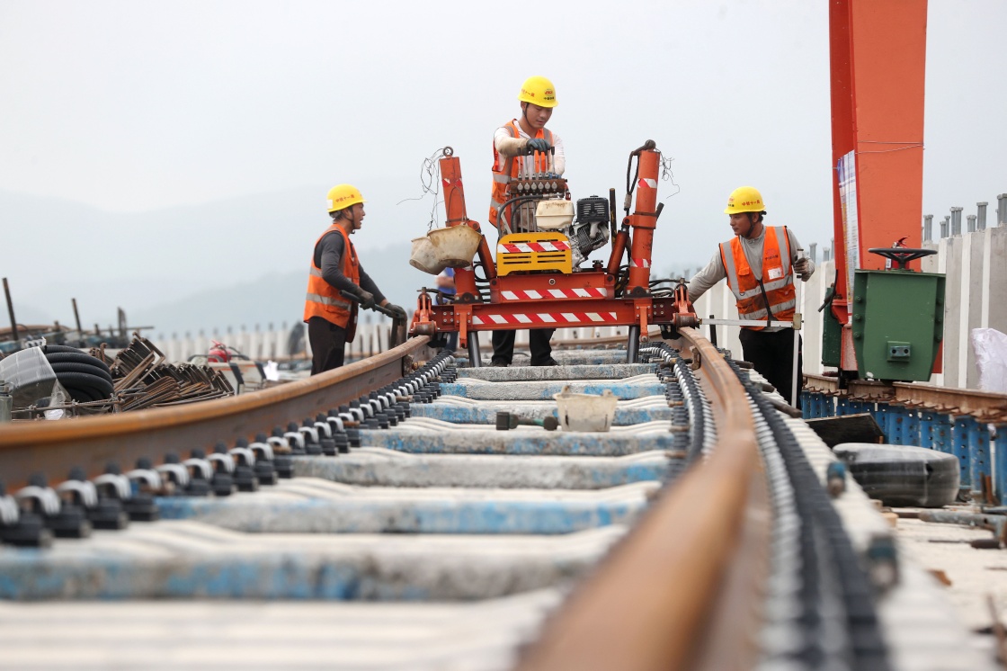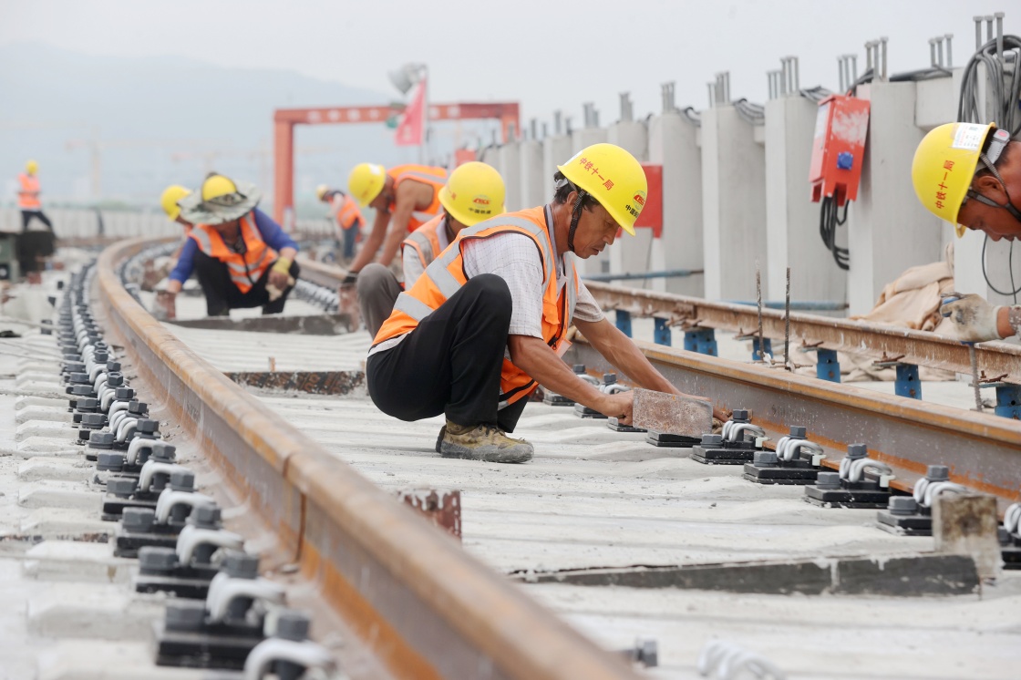 10月1日,中鐵十一局建設(shè)者在浙江省湖州市德清縣杭德市域鐵路高架線鋪軌現(xiàn)場(chǎng)施工作業(yè)。