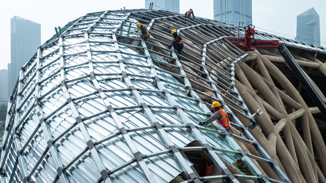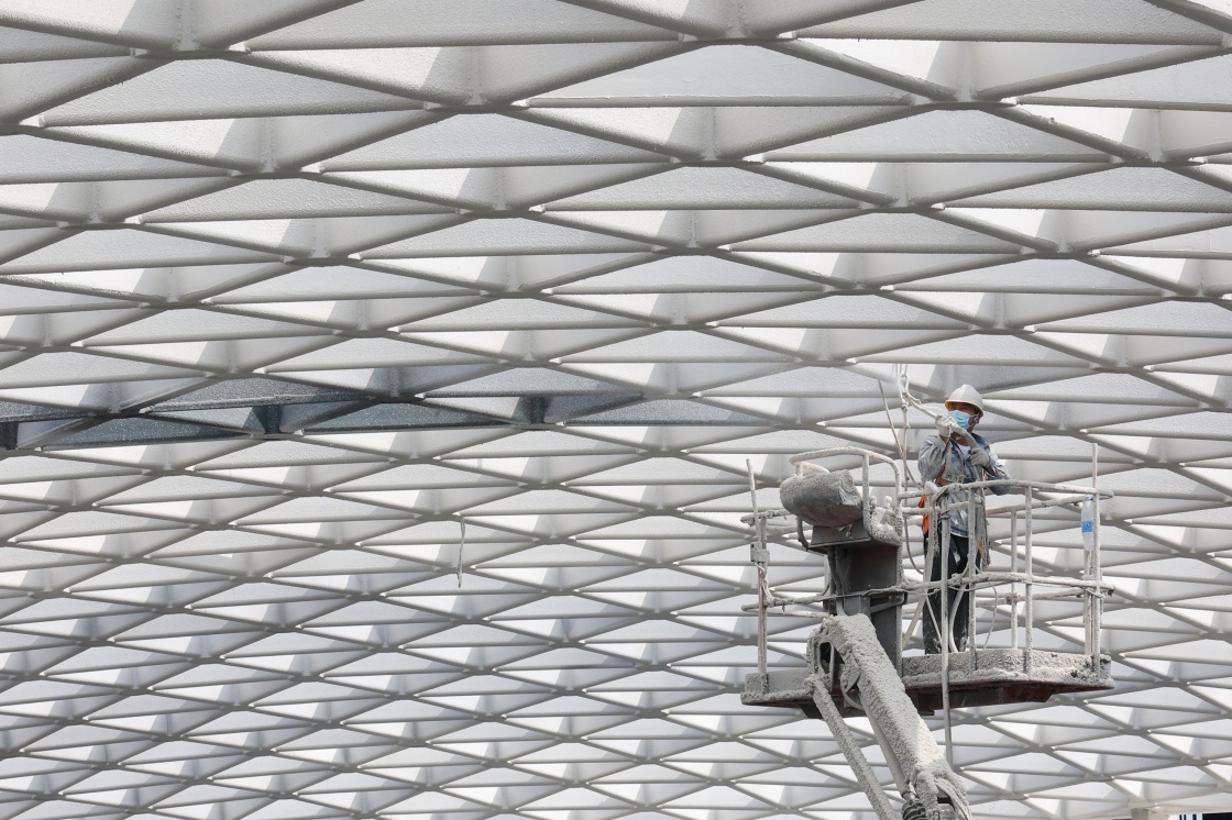 10月1日,在江蘇省無錫市奧體中心三期項(xiàng)目現(xiàn)場(chǎng),中建二局工人對(duì)鋼結(jié)構(gòu)進(jìn)行防火涂料噴涂作業(yè)。