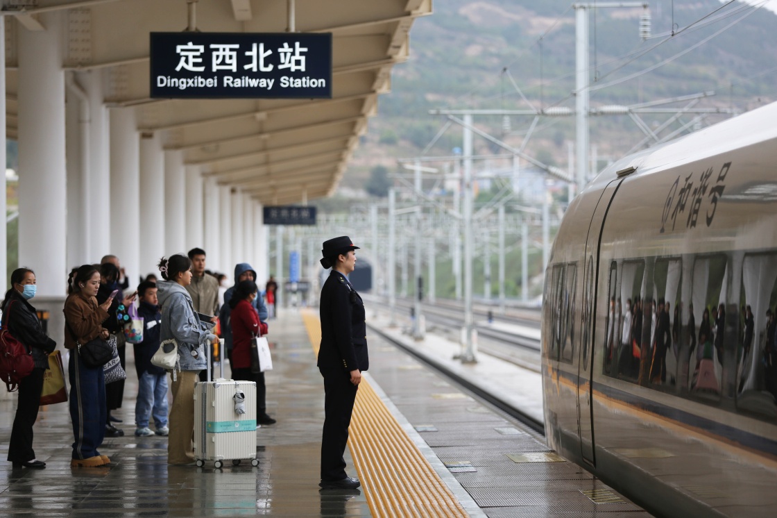 10月1日,寶蘭高鐵甘肅定西北站工作人員在站臺(tái)上接車。