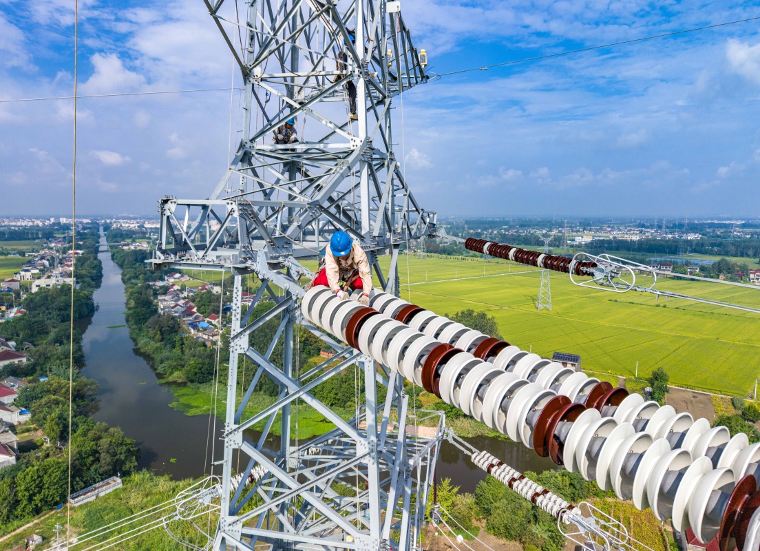 10月1日,在江蘇省揚(yáng)州市江都區(qū)吳橋鎮(zhèn),電力人員在揚(yáng)州-鎮(zhèn)江±200千伏直流輸電二期工程施工現(xiàn)場(chǎng)作業(yè)(無人機(jī)照片)。