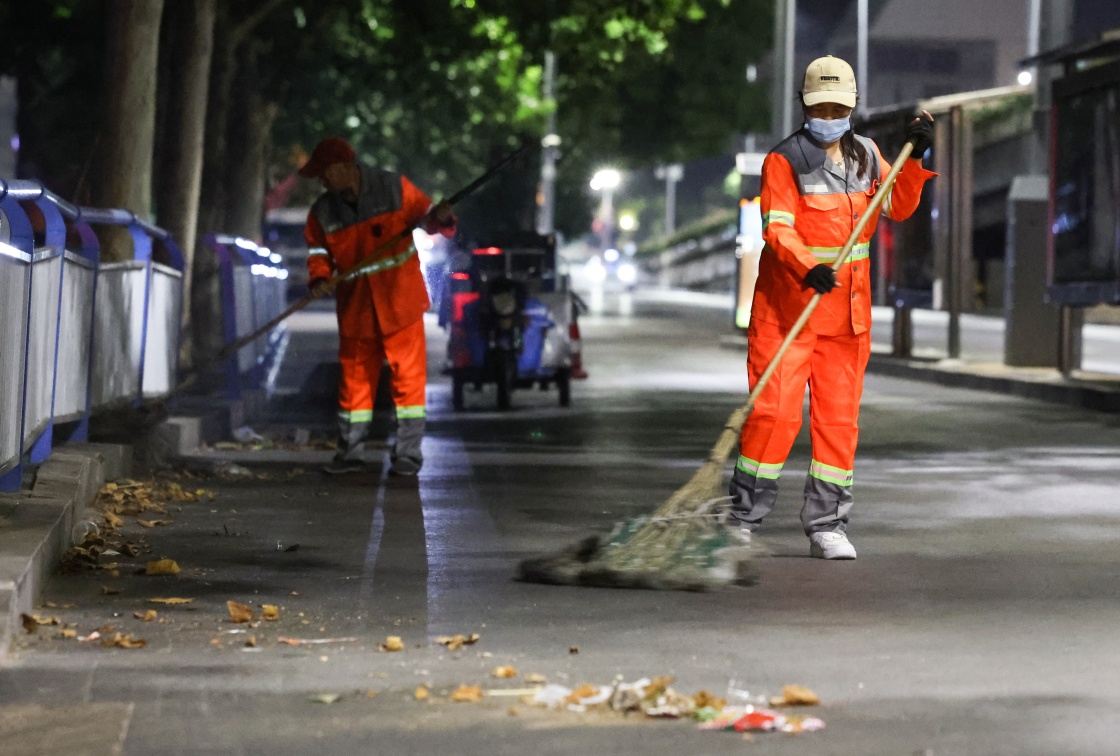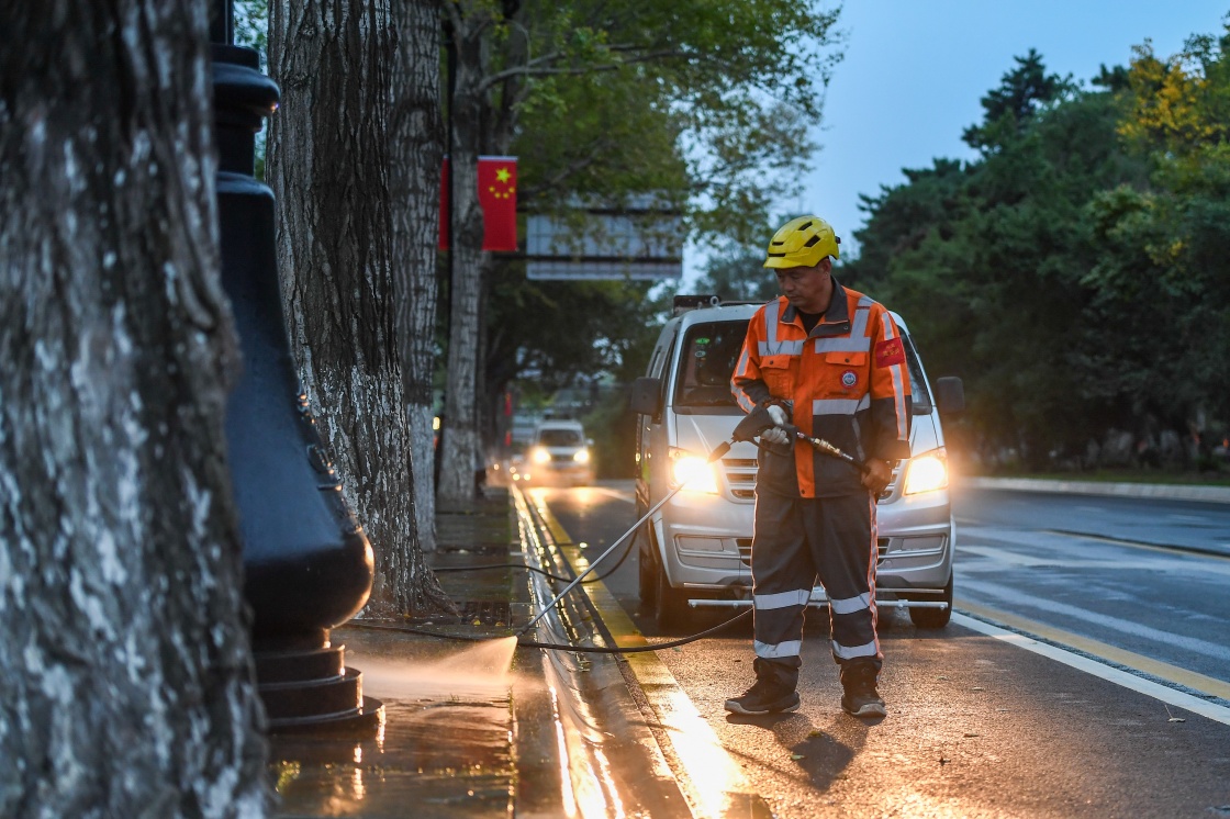 10月1日,河北省石家莊市新華區(qū)環(huán)衛(wèi)工人在中華大街進(jìn)行道路晨掃工作。