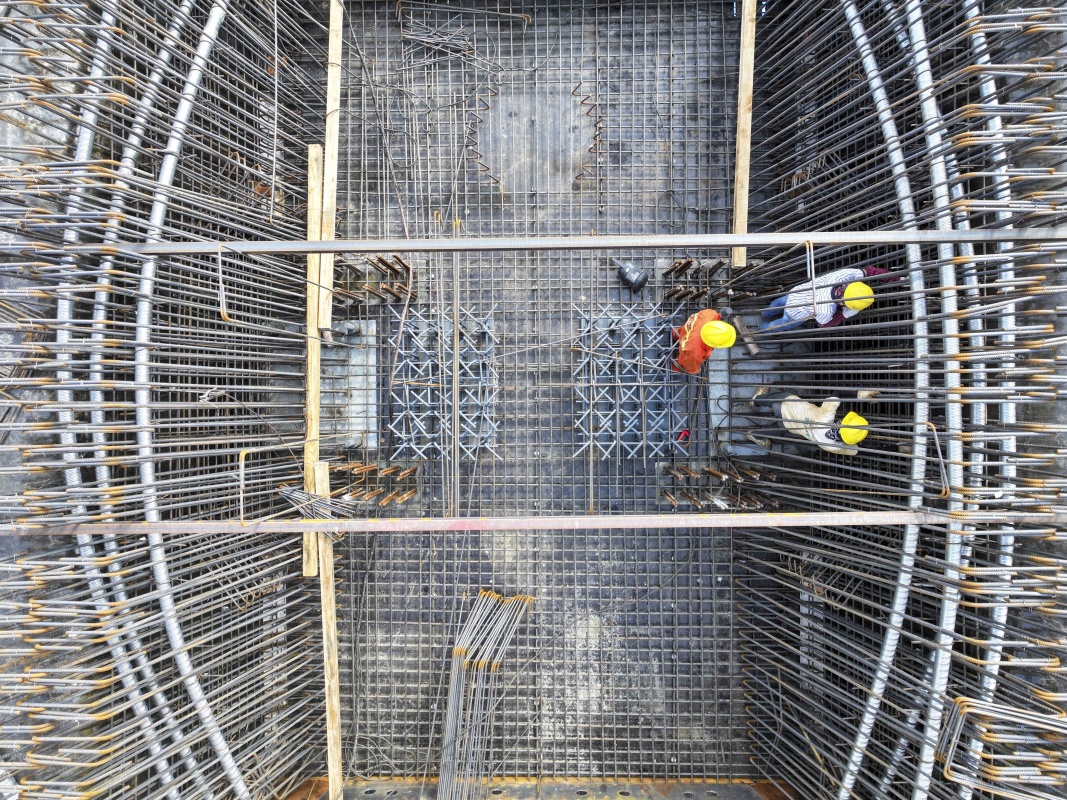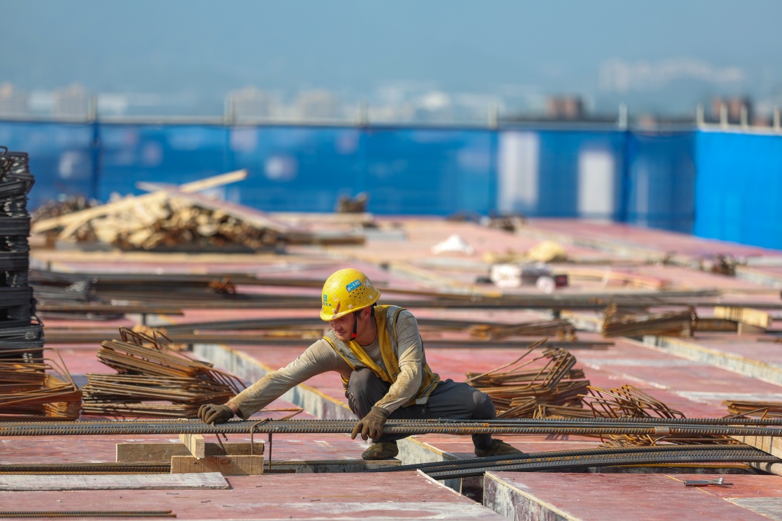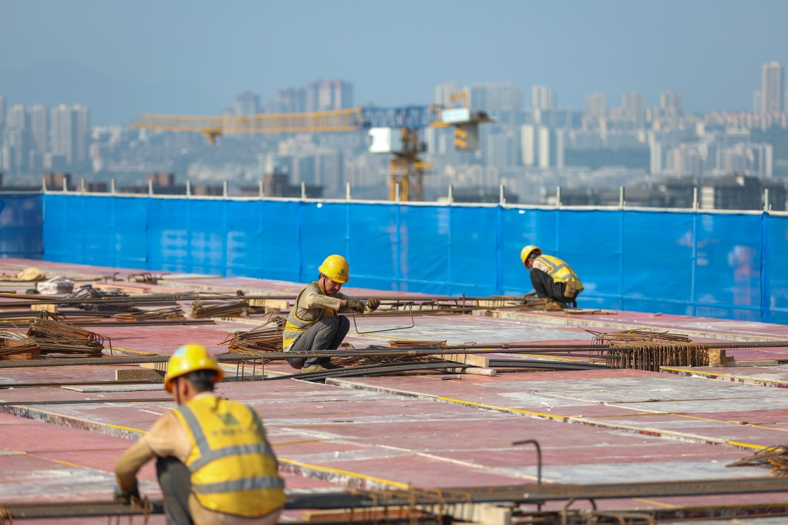 10月1日,在重慶市兩江新區(qū),中建八局的施工人員在兩江新區(qū)禮嘉創(chuàng)新中心項(xiàng)目進(jìn)行綁鋼筋作業(yè)。