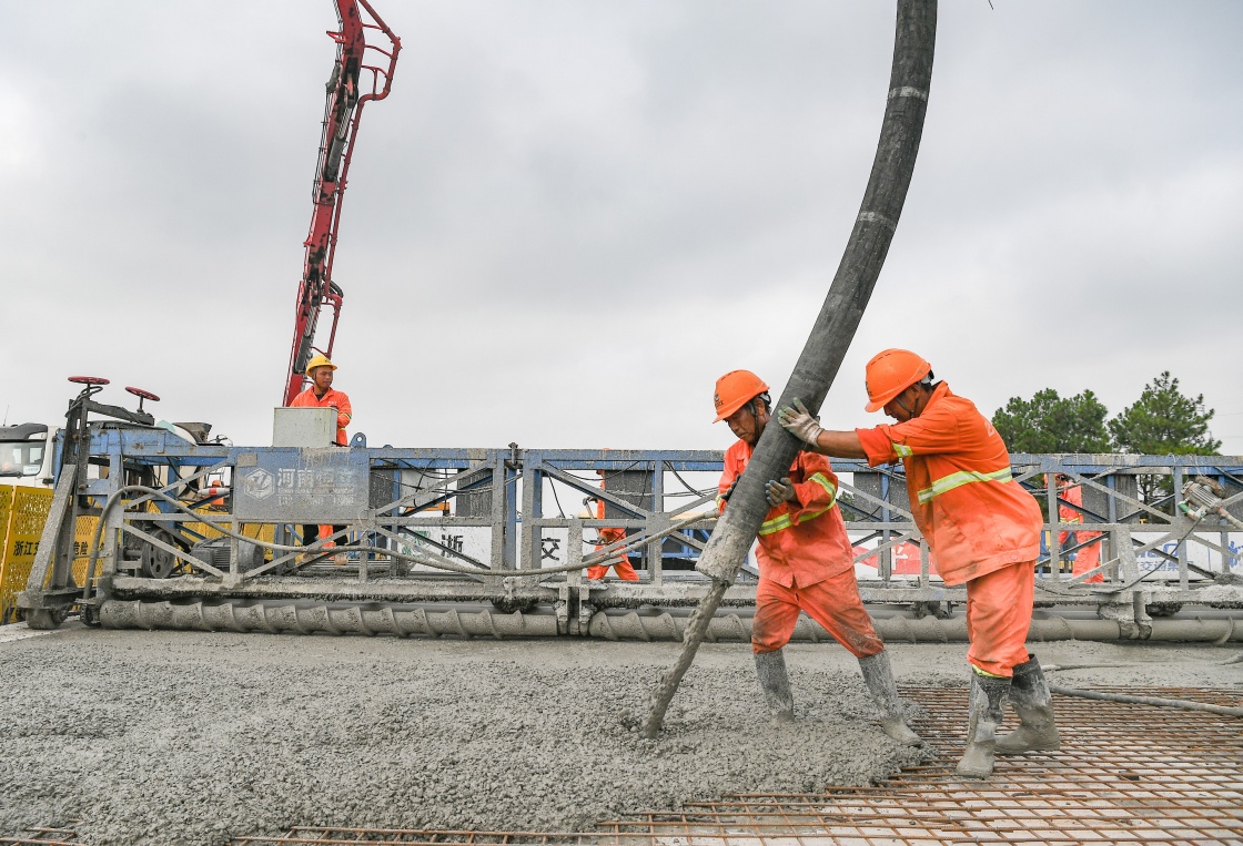 10月1日,在浙江省金華市甬金衢上高速公路金華城區(qū)段工地,施工人員在澆筑混凝土。